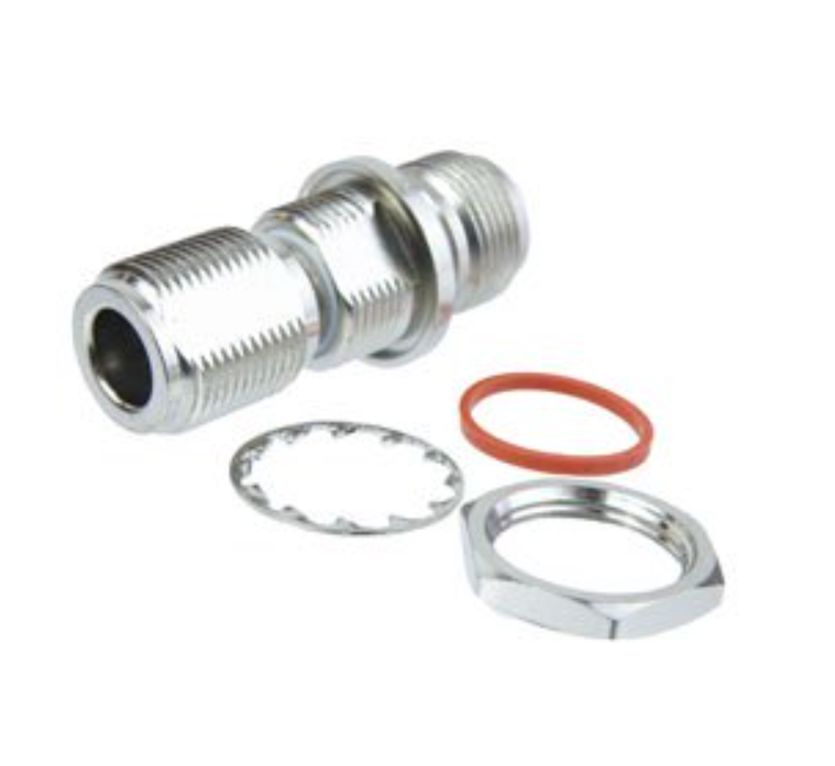 Переходник с гнезда N (гнездо) на гнездо N (гнездо), корпус из никелированной латуни, высокотемпературный, КСВН 1,4, полное сопротивление 75 Ом