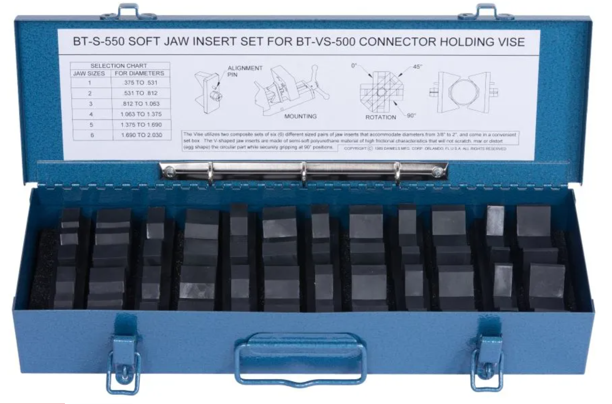 Вставки для челюстей поставляются в удобном металлическом контейнере, который обеспечивает их чистоту, порядок и готовность к использованию. Также имеются инструкции по их правильному использованию. В контейнере имеется двенадцать пар вставок для губок диаметром от 3/8 дюйма до 3 дюймов.